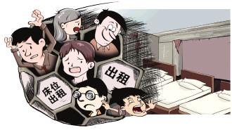 一间十几平方米的客厅里,并排摆着3张大床,床与床之间以置物架隔开,阳台上也摆着一张大约1米宽的床,除去这些,房间里仅剩下“L”形的通道供人走动,大床日租100元,阳台床位日租60元。