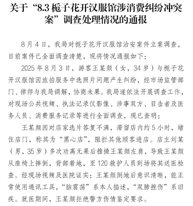 8月7日,西安市公安局雁塔分局官微“@雁塔公安”通报称已立案开展调查。8月9日,“@雁塔公安”发布详细调查通报,还原事实真相。通报称,涉事女子王某颜因对店家选片答复不满,滞留店内约5小时,堵住店门,阻拦其他顾客进店。店主刘某多次劝离无果后推搡王某颜左肩,导致王某颜从座椅上摔倒。经现场视频及医院证实:王某颜倒地后意识清晰,能正常使用通讯工具,“脑震荡”系本人描述,“双肺挫伤”系旧疾。王某颜在警方调查期间,为制造舆论压力、博取网友同情,刻意隐瞒民警两次组织双方调解、同行人员情况、就医期间多次外出等事实,联系并利用媒体,持续在网络上发布“被殴打致昏迷”“民警未做笔录、勾连商家”“孩子挨饿无人照顾”等不实信息,造成严重影响。王某颜涉嫌寻衅滋事被处六日拘留处罚,店主刘某涉嫌故意伤害他人被处五日拘留处罚。该通报发出后舆论反转,多数网民点赞当地警方依法处置,批评个别媒体失实传播,部分舆论还围绕消费维权失度、网络言论责任等深层问题展开探讨。截至8月28日12时,全网相关信息3.2万余条,“#西安汉服馆冲突双方被拘留#”等微博话题阅读量约5000万。