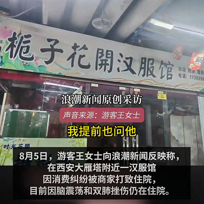 8月3日至4日,抖音用户“宝地二楼丫丫拖鞋泳衣”发布多个视频称,其一行人在西安旅游拍照遭遇“黑店”,栀子花开汉服馆不履行“微信选片”承诺,致其在店内被拖延六七个小时,该游客找老板理论时却遭到殴打,声称“被打成脑震荡、双肺挫伤,孩子无人管饿得直哭,警方等有关部门不作为”。部分网民留言批评涉事商家“给西安形象抹黑”,支持该女子维权。8月6日,浪潮新闻单方面采访当事女子,该女子称其因不满拍摄和选片向店里的其他游客吐槽,被商家认为是“闹事”影响门店生意,遭挥拳打晕。有媒体根据此报道设置“游客在西安因消费纠纷遭商家殴打”等话题,同时该女子控诉“我们来西安是旅游的,不是来挨打的”短视频在大象新闻、温州都市报等媒体的传播助推下,引起群情激愤,涉事商家遭到网民谴责。