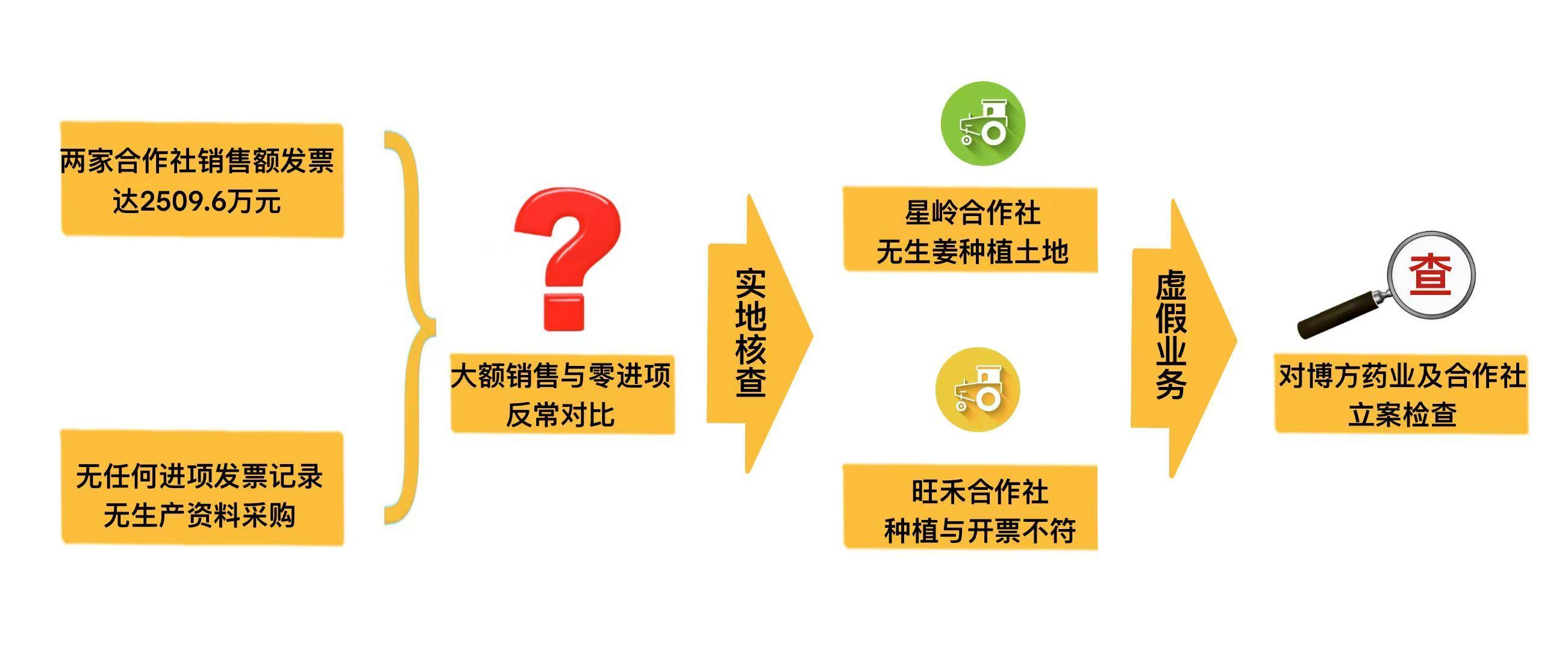 为核实情况,税务人员前往两家合作社的生产经营地实地调查。通过走访得知,星岭合作社在当地没有任何生姜种植土地及种植业务。而旺禾合作社2021年实际未种植生姜,2022年至2023年虽有种植,按实际产量及当时市场平均收购价核算,合理销售额不足100万元,且无外购生姜记录,却向博方药业开具了775.26万元的销售发票。