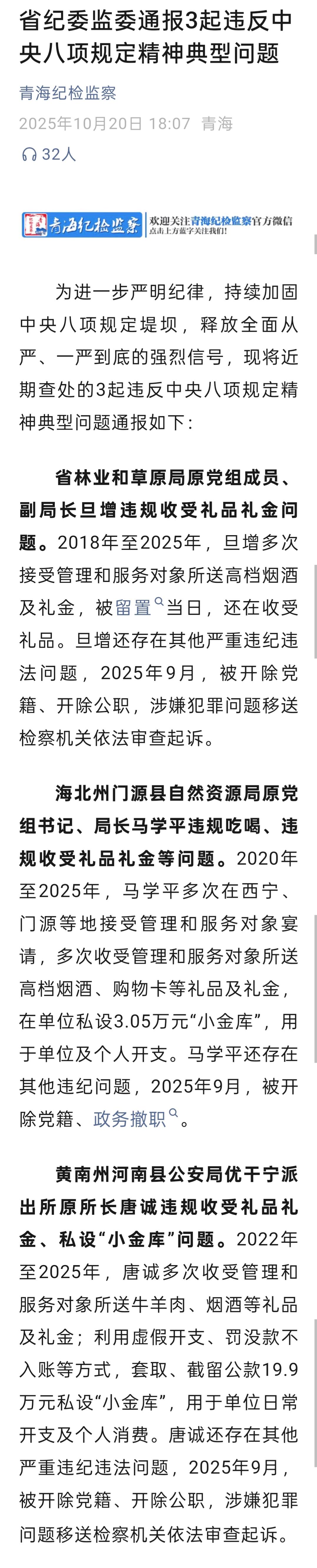 为进一步严明纪律,持续加固中央八项规定堤坝,释放全面从严、一严到底的强烈信号,10月20日,青海省纪委监委通报近期查处的3起违反中央八项规定精神典型问题。