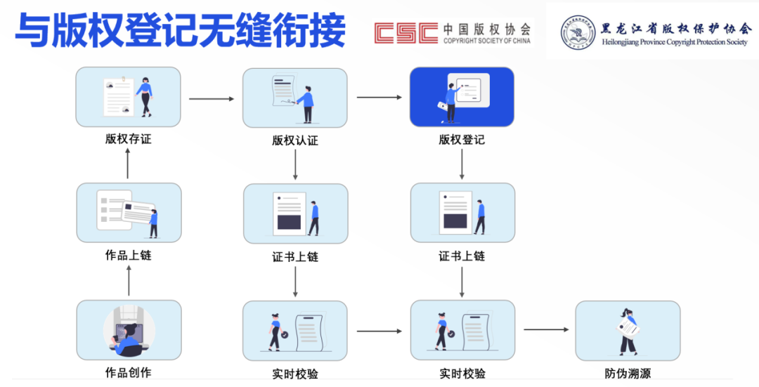 在此基础上,进一步加强版权确权和保护效率,黑龙江版权保护协会和中国版权协会的中国版权链达成战略合作。结合区块链技术,进行数字版权登记,实现了版权存证、认证和版权登记的无缝衔接,大大提升了版权登记的数字化水平和版权登记效率。并积极探索AIGC领域的权利认定等前沿问题。
