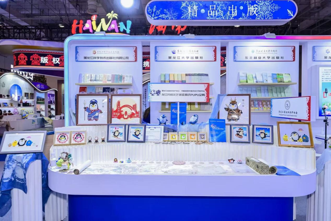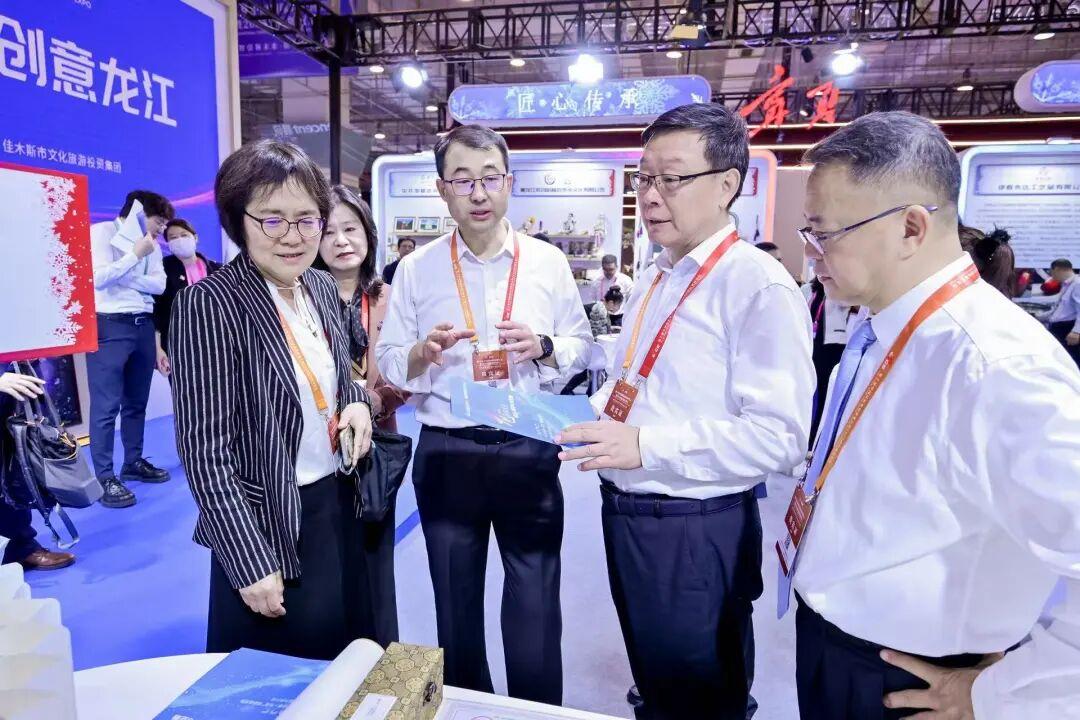在黑龙江省展区,在黑龙江省委宣传部(省版权局)指导下,黑龙江省版权保护协会联合腾讯、中国版权链,共同策划呈现了"PUPU企鹅+非遗"创新专题展。该项目邀请黑龙江非遗传承人,将鱼皮画、剪纸、蓝布印染等传统非遗技艺与潮流IP“pupu企鹅”进行创新融合,通过传统技艺创新演绎潮流IP,让古老非遗在现代设计语境的诠释下焕发全新生命力。共同构建出“非遗活化+IP授权+版权保护+商业转化”的闭环模式。共同探索实现传统民间技艺与国际化IP的创造性转化和创新性发展。为传统文化与现代商业的融合提供了可复制的创新路径。此次创新成果展得到了中国版权协会领导的大力支持和高度肯定,中国版权协会理事长周慧琳、副理事长兼秘书长杜贤莅临展区参观指导并与工作人员深入交流非遗技艺的创造性转化,并指出要抓住版权这个关键要素,务求实效,让非遗技艺传承下去并创新性发展。