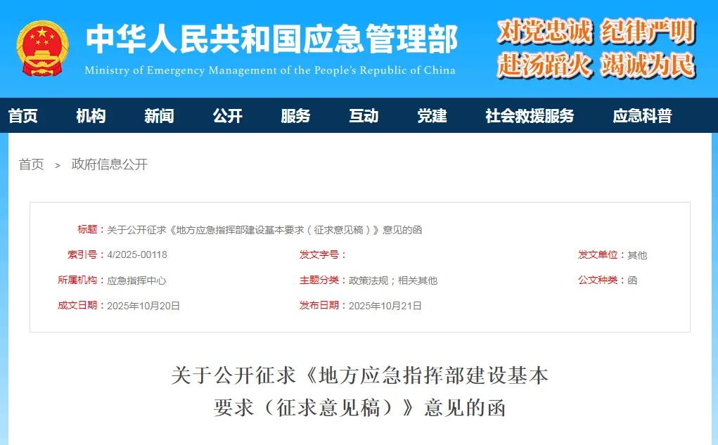 根据应急管理部标准制修订计划安排,应急管理部应急指挥中心组织起草了《地方应急指挥部建设基本要求(征求意见稿)》和编制说明(见附件1-2),现向社会公开征求意见。反馈意见请填写《应急管理标准项目征求意见表》(见附件3),并于2025年11月23日之前发送至电子邮箱591724758@qq.com。