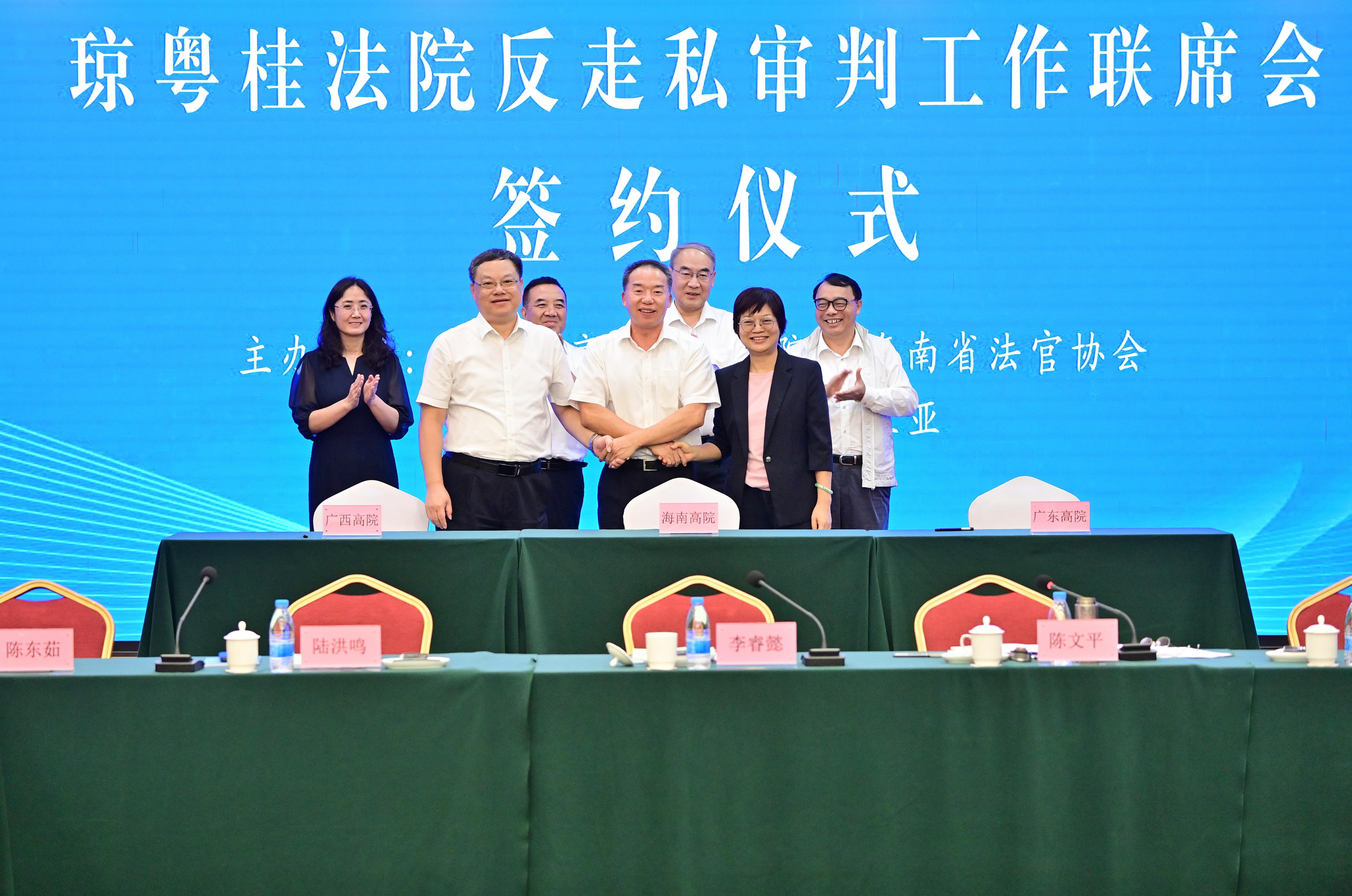 会上,海南省高级人民法院与广东省高级人民法院、广西壮族自治区高级人民法院共同会签了《琼粤桂法院反走私审判工作联席会议机制实施办法(试行)》和《琼粤桂法院反走私案件协作办理机制实施办法(试行)》。