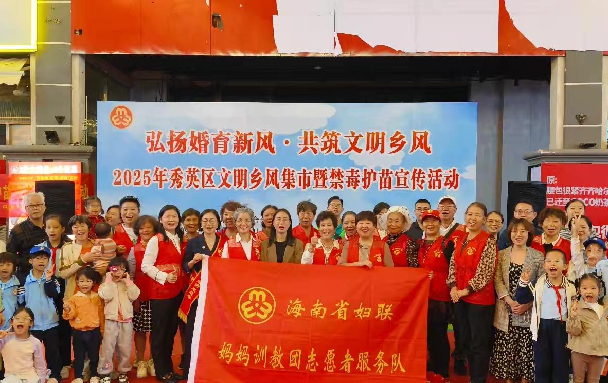 2025年10月24日下午,海南省妇联“妈妈训教团”志愿者服务队联合海口市秀英区妇联、秀英区文明办、秀英区司法局、秀英区民政局、团秀英区委、秀英街道办事处、北京盈科(海口)律师事务所、海口市“妈妈驿站”(秀英站)、海口市博纳社会工作服务中心等单位,共同举办“弘扬婚育新风·共筑文明乡风”2025年秀英区文明乡风集市暨禁毒护苗宣传活动。