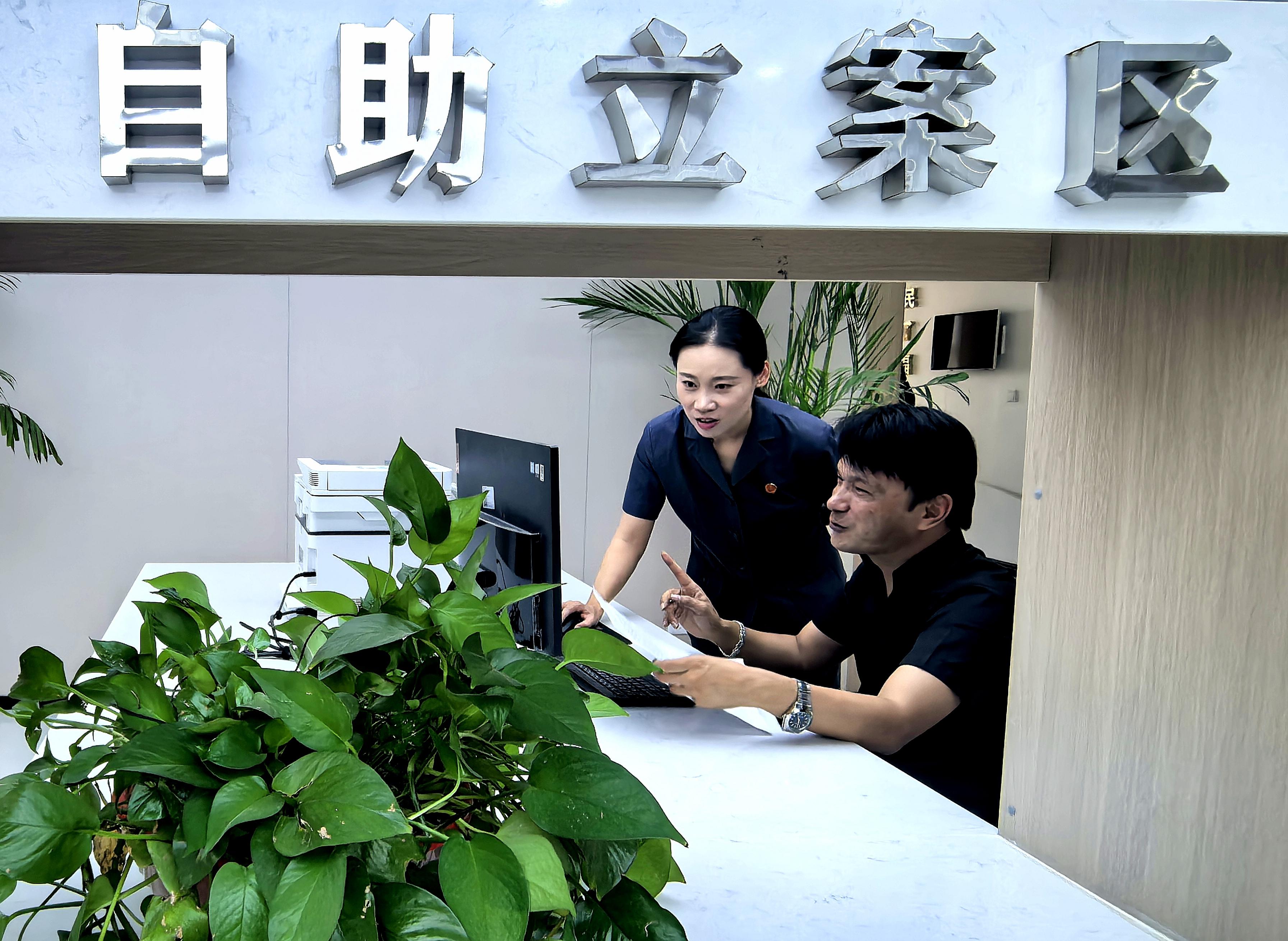 喀什市人民法院自由贸易试验区喀什片区人民法庭法官指导群众在自助立案区填写申请立案材料。 潘从武 摄