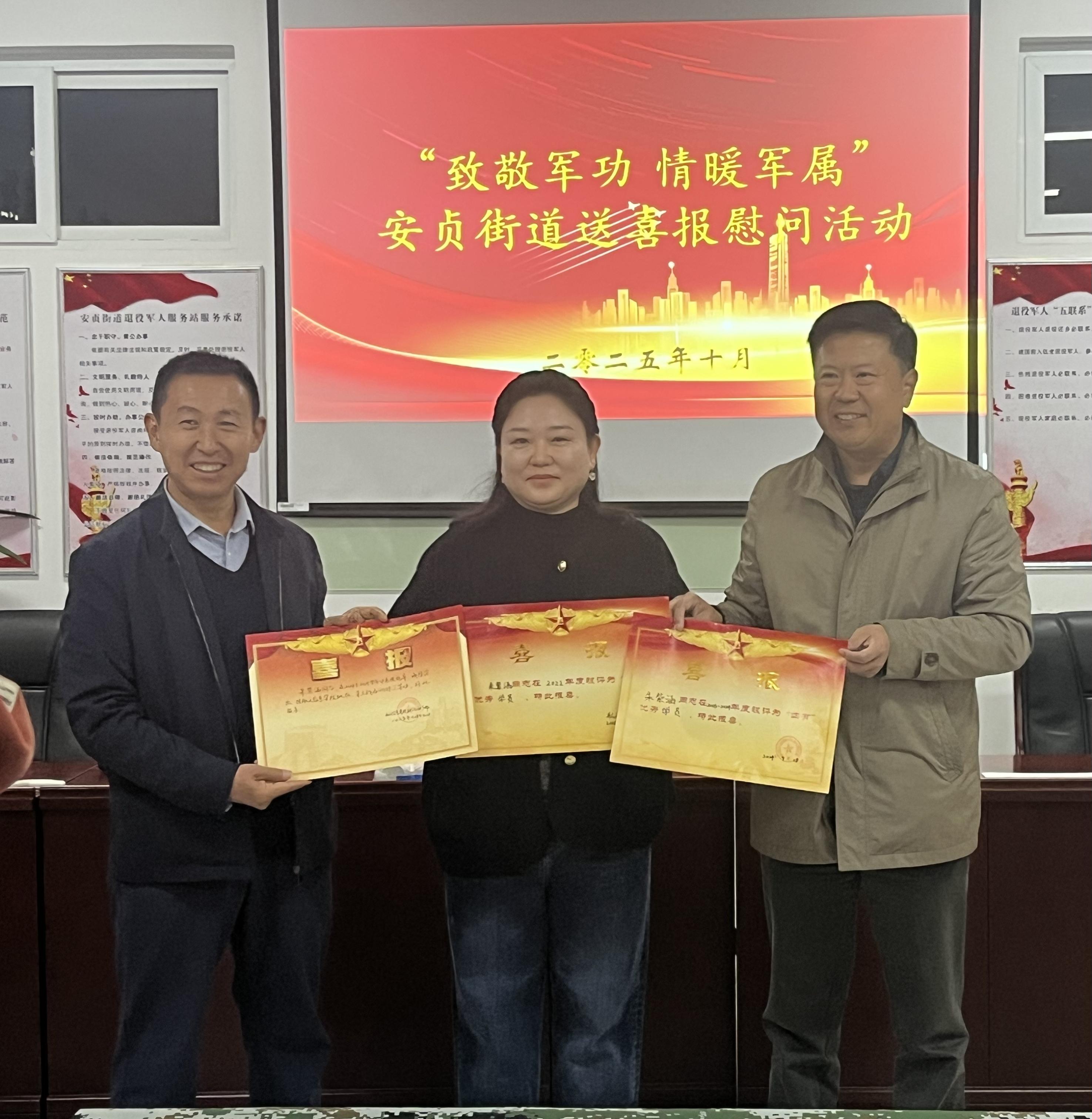 近日,北京市朝阳区安贞街道便民服务中心内洋溢着热烈而喜庆的气氛。朝阳区退役军人事务局副局长战京贤、安贞街道武装部部长张建波、安贞街道黄寺社区党委书记隗彬、安贞街道便民服务中心副主任刘爽等一行专程到访,为荣立三等功的官兵家庭举行庄重而温馨的送喜报仪式。