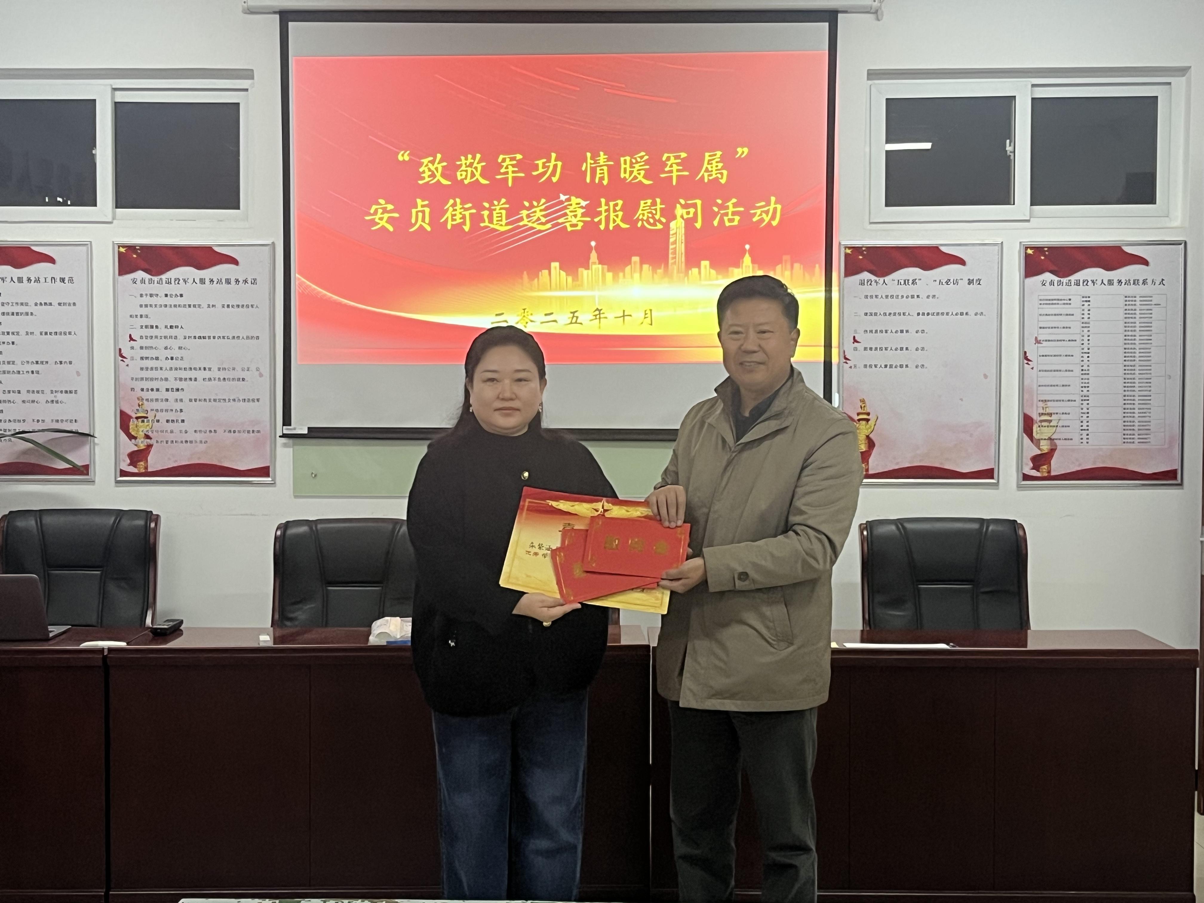 活动现场,在热烈的掌声中,朝阳区退役军人事务局副局长战京贤与安贞街道武装部部长张建波共同将金光闪闪的喜报和满载组织关怀的奖励金郑重送到刘女士手中。军人的母亲刘女士满怀激动与荣耀,接过了承载着女儿卓越成绩的喜报和慰问金,并与区双拥办和安贞街道领导合影留念,记录下这一光荣时刻。