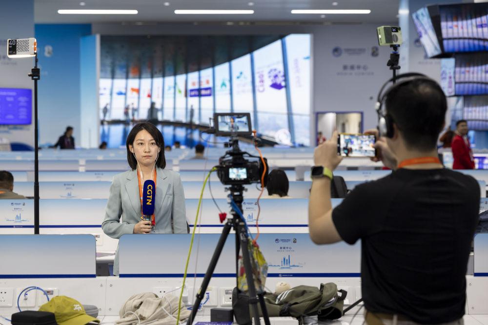 11月4日,媒体记者在第八届进博会新闻中心媒体工作间录制出镜视频。新华社记者 王翔 摄
