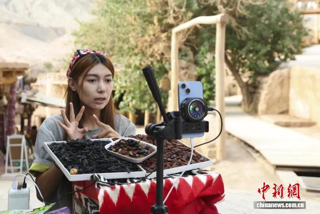2025年9月9日,新疆鄯善县吐峪沟景区商户在直播卖货。中新社记者 王紫儒 摄