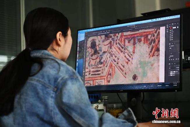 2024年6月5日,甘肃省敦煌市,敦煌研究院文物数字化研究所科研楼内,工作人员进行数字化图像拼接处理。中新社记者 李亚龙 摄