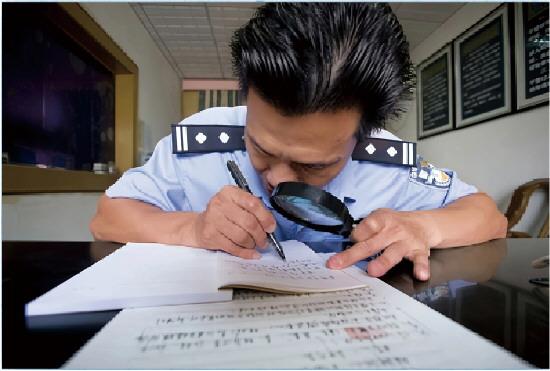 黎定琦 1965年9月出生,现为海南省昌江黎族自治县公安局党委委员、副政委。1999年,他在与持枪劫匪的战斗中负伤,导致右眼失明,左眼视力仅为0.02。至今,他的双眼和胸部仍有10多粒铁砂无法取出。负伤后,黎定琦原本可以调到相对轻松的岗位,但他不愿“躺在功劳簿上过生活”。干好刑警,侦破案件,仍然是他最想干的事。2008年,黎定琦被授予“全国公安系统一级英雄模范”。图为因视力所限,黎定琦在日常工作中必须借助放大镜看材料。 本报记者 邢东伟 摄