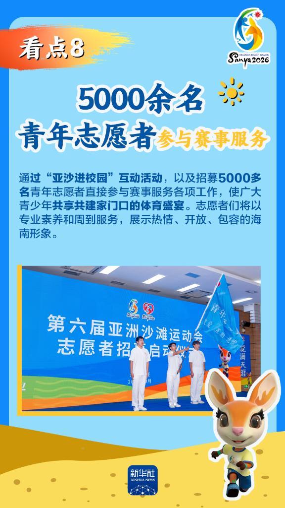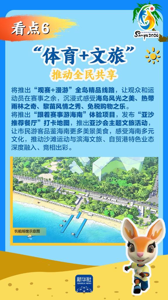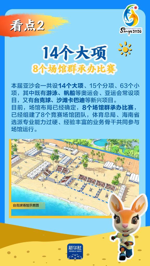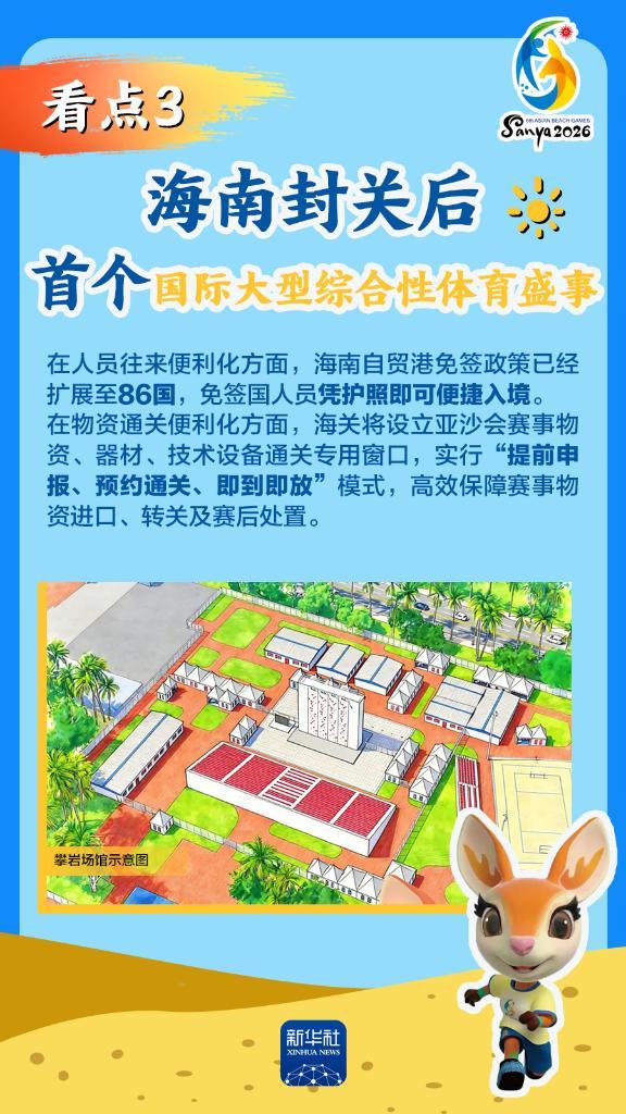 第六届亚洲沙滩运动会(以下简称“亚沙会”)将于2026年4月22日至30日在海南三亚举行,赛事历时9天。作为海南自由贸易港封关运作后迎来的首个国际大型综合性体育盛事,亚沙会都有哪些看点?为何值得期待?国新办12日发布会做了详细介绍,一起来看。