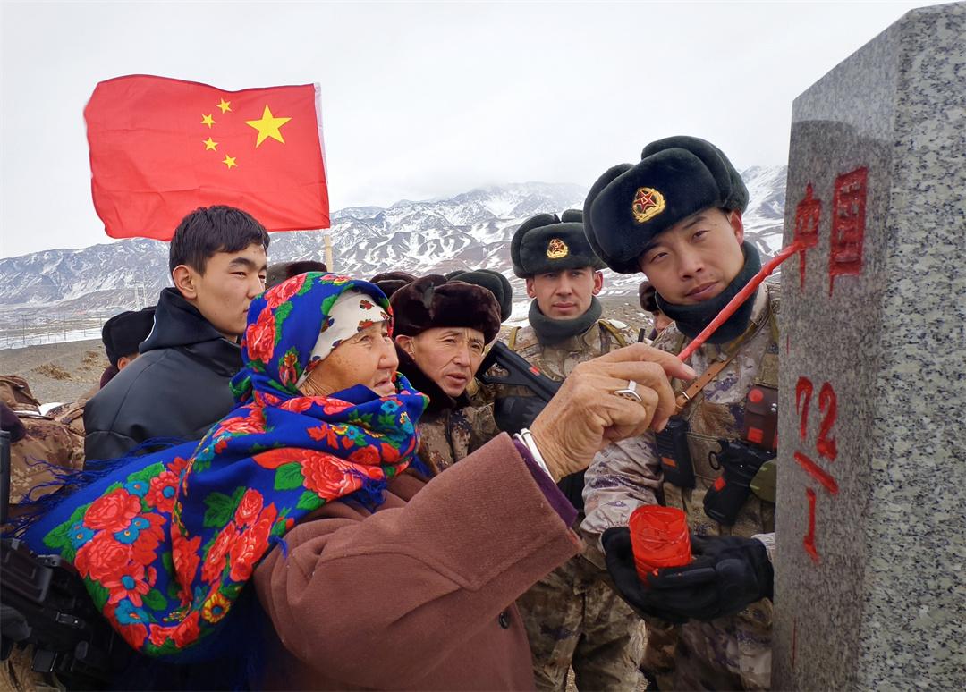 图为“人民楷模”布茹玛汗·毛勒朵与斯姆哈纳边防连官兵一起为界碑描红。