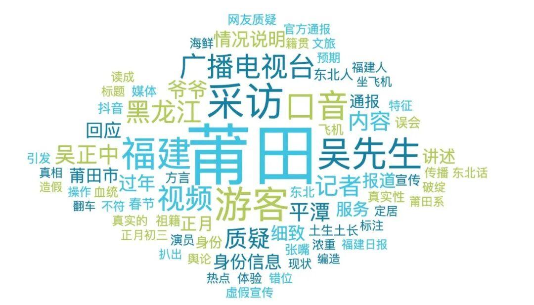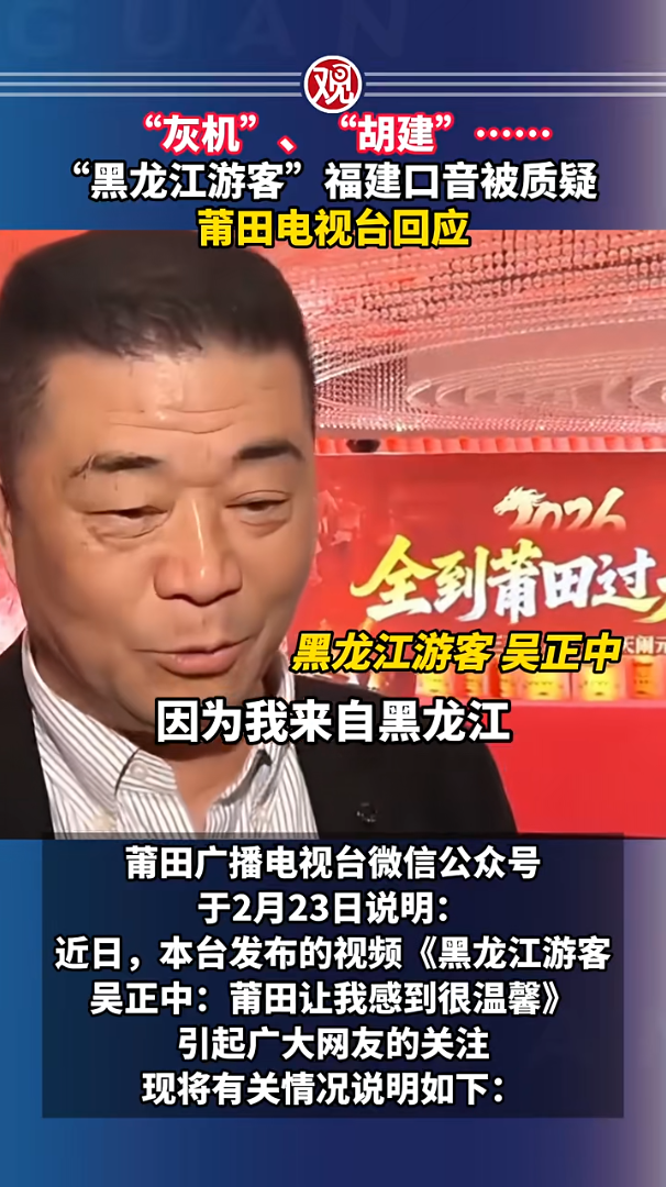 2月21日,福建莆田广播电视台为宣传当地“全到莆田过大年”新春文旅活动,发布了一则视频《黑龙江游客吴正中:莆田让我感到很温馨》。视频中吴正中自称黑龙江游客,称“专程坐飞机11小时来莆田过年”,并盛赞当地海鲜和民俗。然而细心的网民发现其口音带有典型的福建方言特征,如将“飞机”读作“灰机”、“福建”读作“胡建”,对其“东北人”的身份表示怀疑。