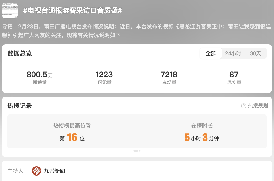 截至2月27日17时,相关信息量近3万条,微博话题“#被质疑采访口音游客工作生活在福建#”“#电视台通报游客采访口音质疑#”“#被质疑口音当事游客爷爷为黑龙江人#”“#黑龙江游客张嘴却是福建口音#”等阅读量累计达1545万。