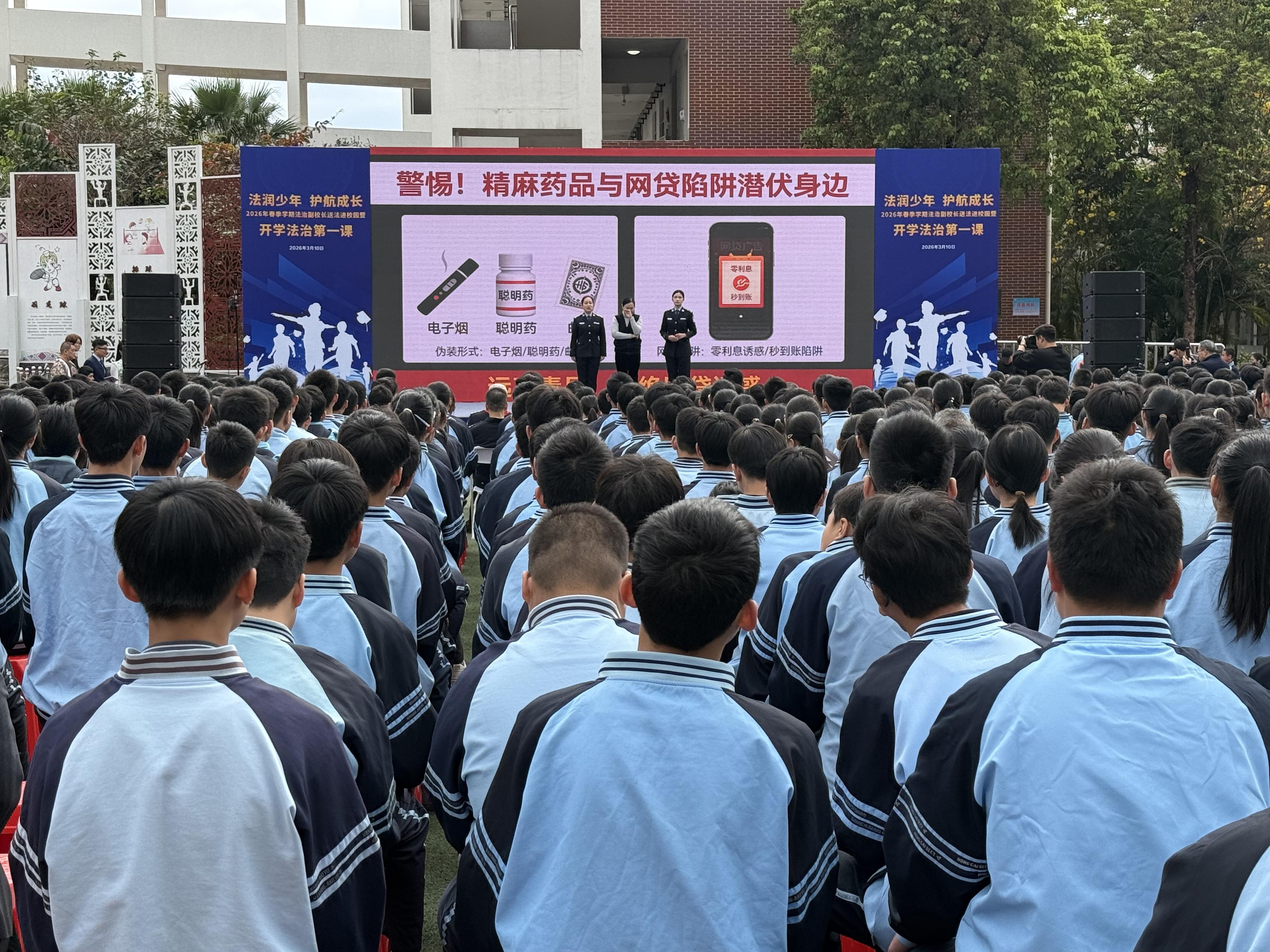3月10日,由广西壮族自治区司法厅、教育厅联合主办的2026年春季学期法治副校长送法进校园暨“开学法治第一课”活动在广西各地同步举行。本次活动深入学习贯彻习近平法治思想,聚焦提升青少年法治教育的针对性、实效性,推动法治副校长在校园法治建设和未成年人保护工作中,实现从“有形覆盖”向“有效履职”的深度转化。