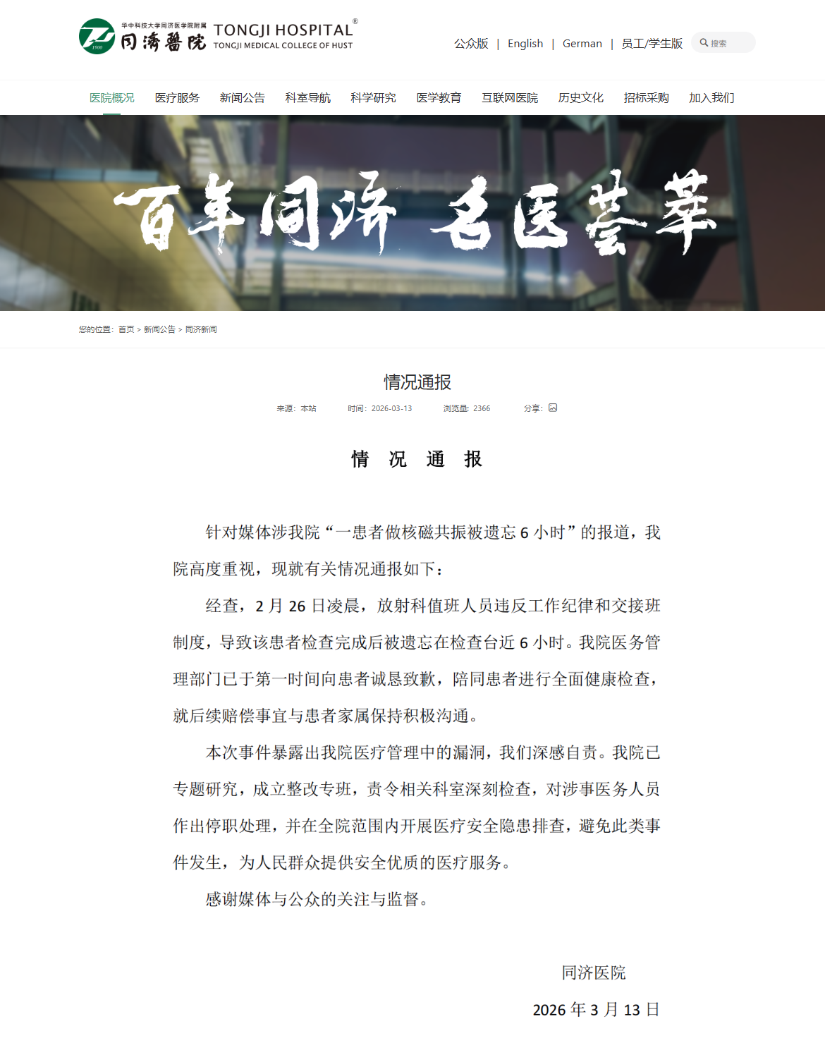 图为同济医院官网发布情况通报。