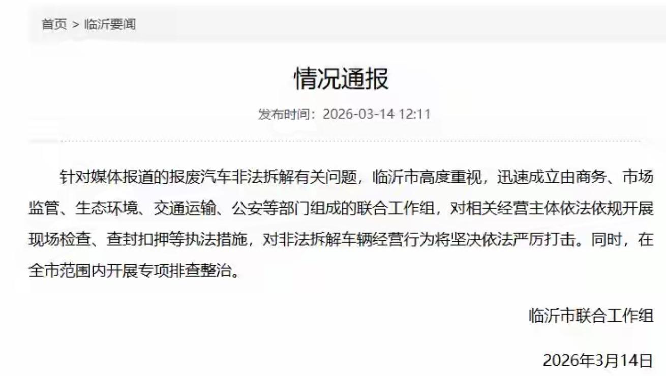 3月14日12时11分,山东省临沂市政府官方新闻门户网站“琅琊新闻网”发布情况通报:针对媒体报道的报废汽车非法拆解有关问题,临沂市高度重视,迅速成立由商务、市场监管、生态环境、交通运输、公安等部门组成的联合工作组,对相关经营主体依法依规开展现场检查、查封扣押等执法措施,对非法拆解车辆经营行为将坚决依法严厉打击。同时,在全市范围内开展专项排查整治。