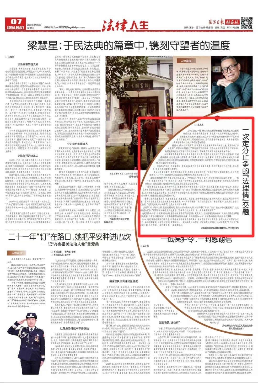 在此之前,《法治日报》于3月15日刊发《一次定分止争的“法理情”交融》,以法官手记的形式讲述该案办理与庭审细节。