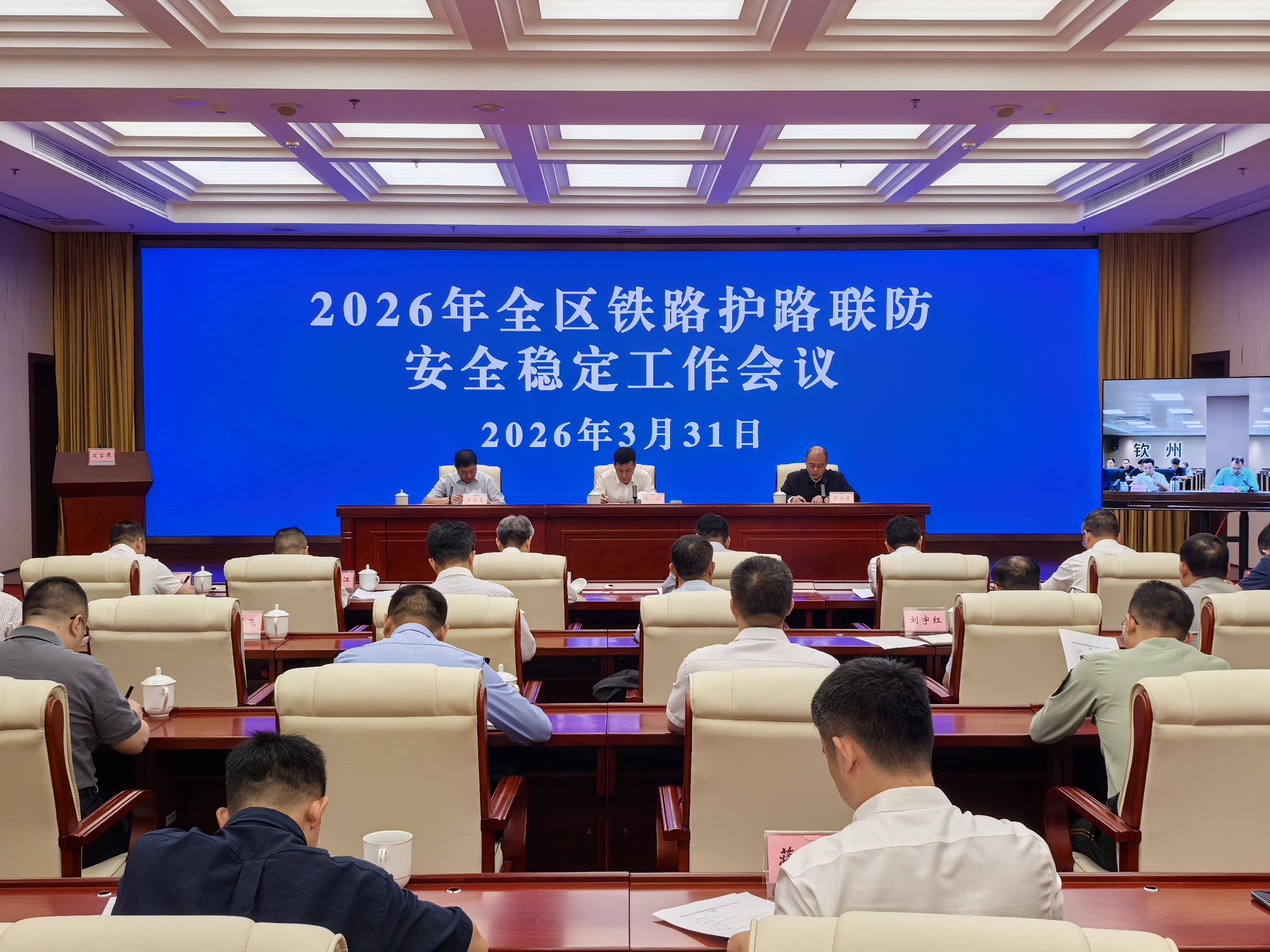 3月31日,广西壮族自治区铁路护路联防安全稳定工作会议以视频形式召开。会议总结2025年以来广西护路联防工作,分析研判铁路安全稳定形势,部署推进下步重点任务。自治区党委政法委副书记、自治区铁路护路联防安全稳定工作制度召集人杨斌,中国南宁局集团有限公司副总经理、自治区铁路护路联防安全稳定工作制度副召集人王政勇出席会议并讲话,自治区公安厅副厅长、自治区铁路护路联防安全稳定工作制度副召集人罗卫东主持会议。