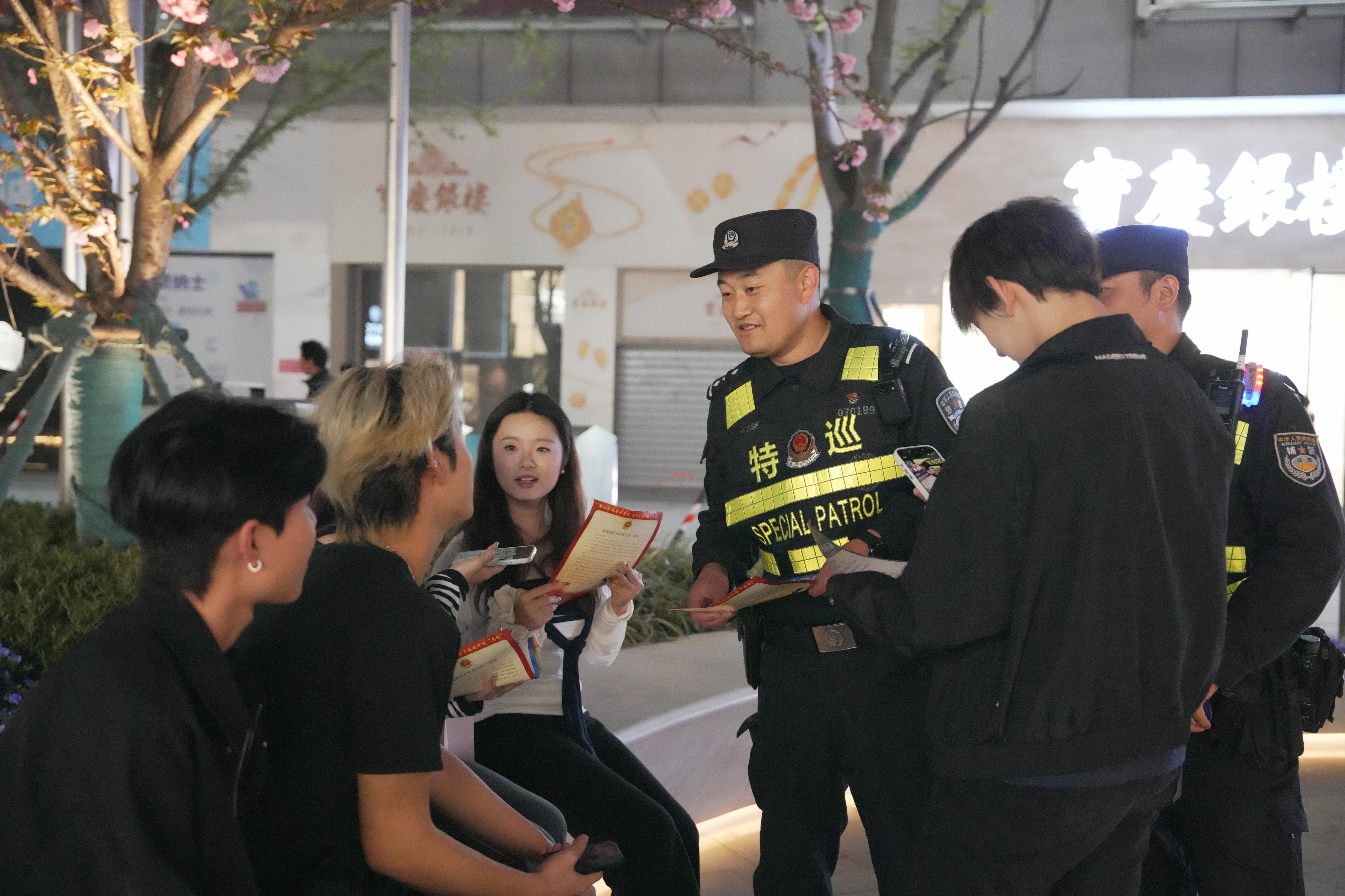 4月4日晚,安徽省芜湖市公安局镜湖分局布署警力在辖区公园、重点街区开展巡逻防控,同时向群众开展普传宣传,守护平安。