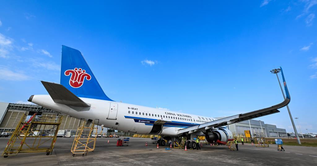 1月29日,海口美兰国际机场停机坪上,南航工程技术分公司机务工程师在对飞机进行深度检查。新华社记者 杨冠宇 摄