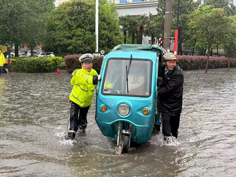 仙桃市公安局根据积水深度分级落实“警示、限行、封控”管理措施,民警辅警化身“推车侠”,冒雨救助抛锚车辆。4月9日上午,民警辅警在巡逻途中发现被大风刮倒、横在路面的树木,迅速开展路面清障,保障辖区道路通行安全。
