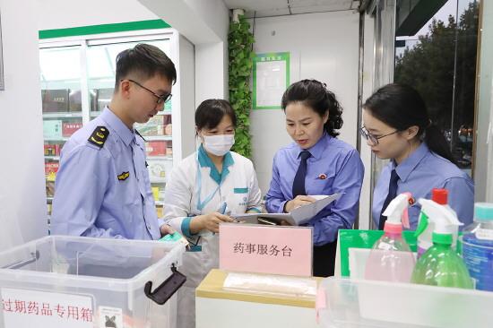 2022年6月14日,胡方(右二)在海州区某药店,对药事服务运行情况开展检察建议“回头看”。 连云港市海州区检察院供图