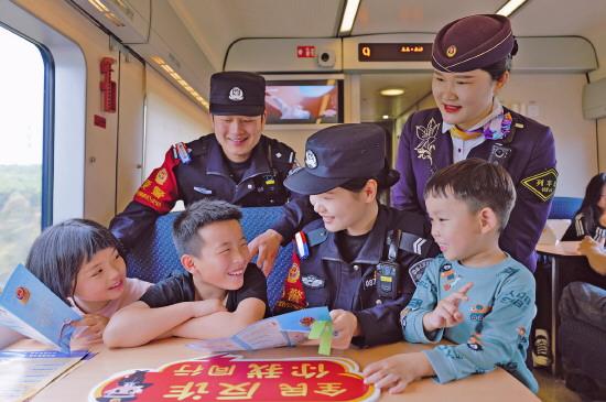 近日,上海铁路公安局杭州乘警支队民警在列车上开展普法宣传,守护旅途平安。图为乘警与列车长在值乘列车上为小旅客讲解行车安全和反诈知识。 本报通讯员 贺瑞明 叶舒婷 摄