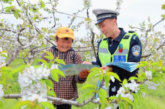 江苏省东海县公安局交管大队石湖中队民辅警近日走进石湖乡石湖林场樱桃种植基地,开展交通安全法律法规宣传,为果农们送上“法治大礼包”。图为民警向果农普及交通安全知识。