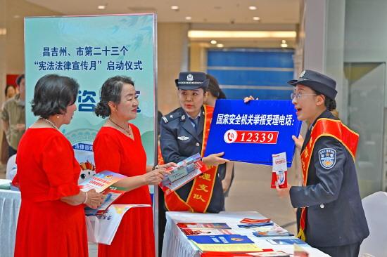 新疆出入境边防检查总站昌吉边境管理支队近日组织民警通过发放宣传手册、现场讲解等方式向群众宣讲宪法及国家安全、边境管理相关法律法规等,提升群众爱边、护边、守边意识。图为民警在昌吉市区人流量较大的商场开展普法。