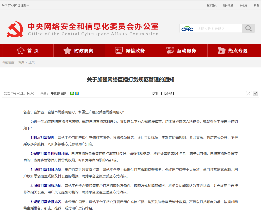 为进一步加强网络直播打赏管理,规范网络直播营利行为,推动网站平台合规健康运营,切实维护网民合法权益,现就有关工作要求通知如下:
