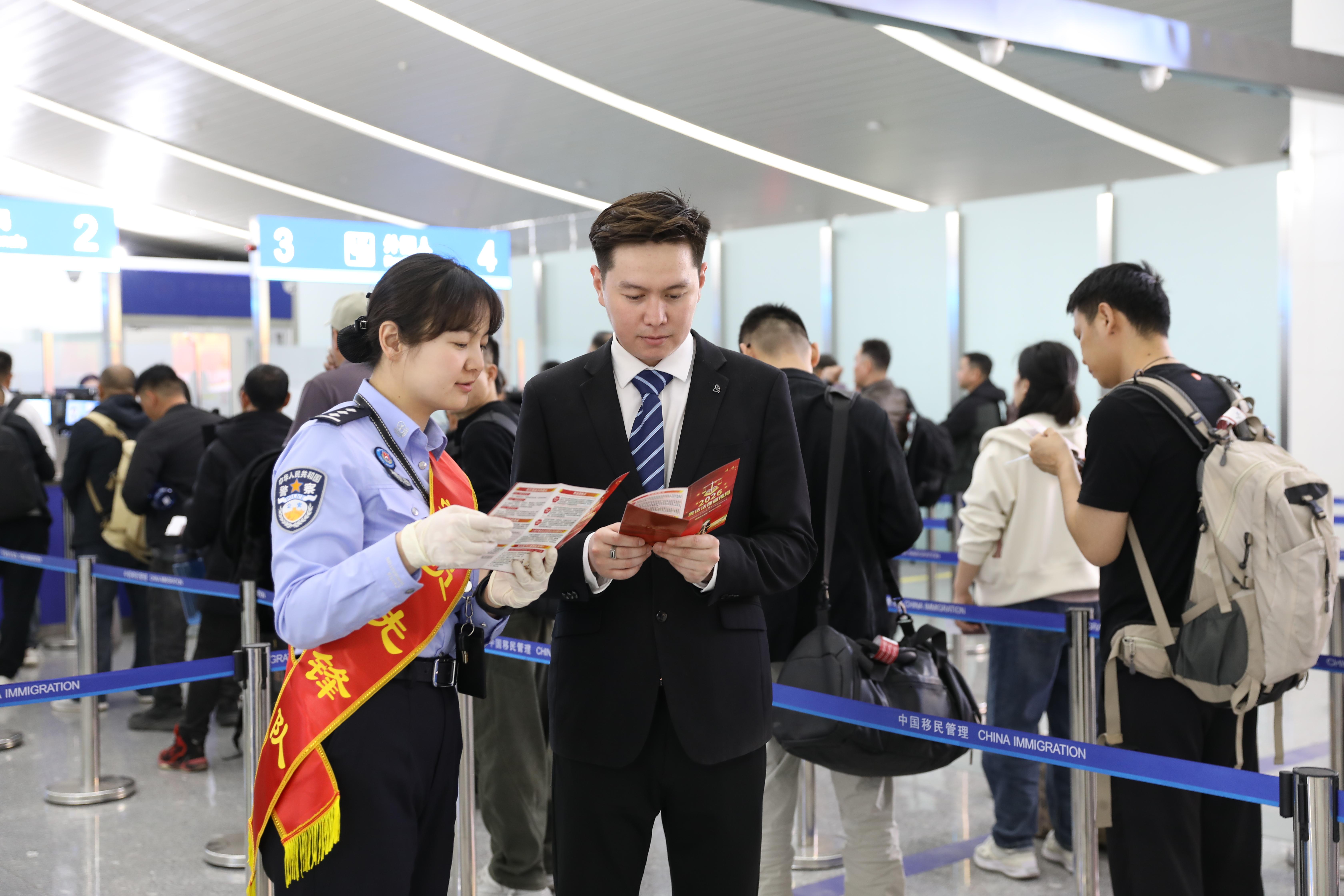 4月9日,伊宁边检站民警在入境大厅向入境旅客开展普法宣传活动。邹瑞 摄