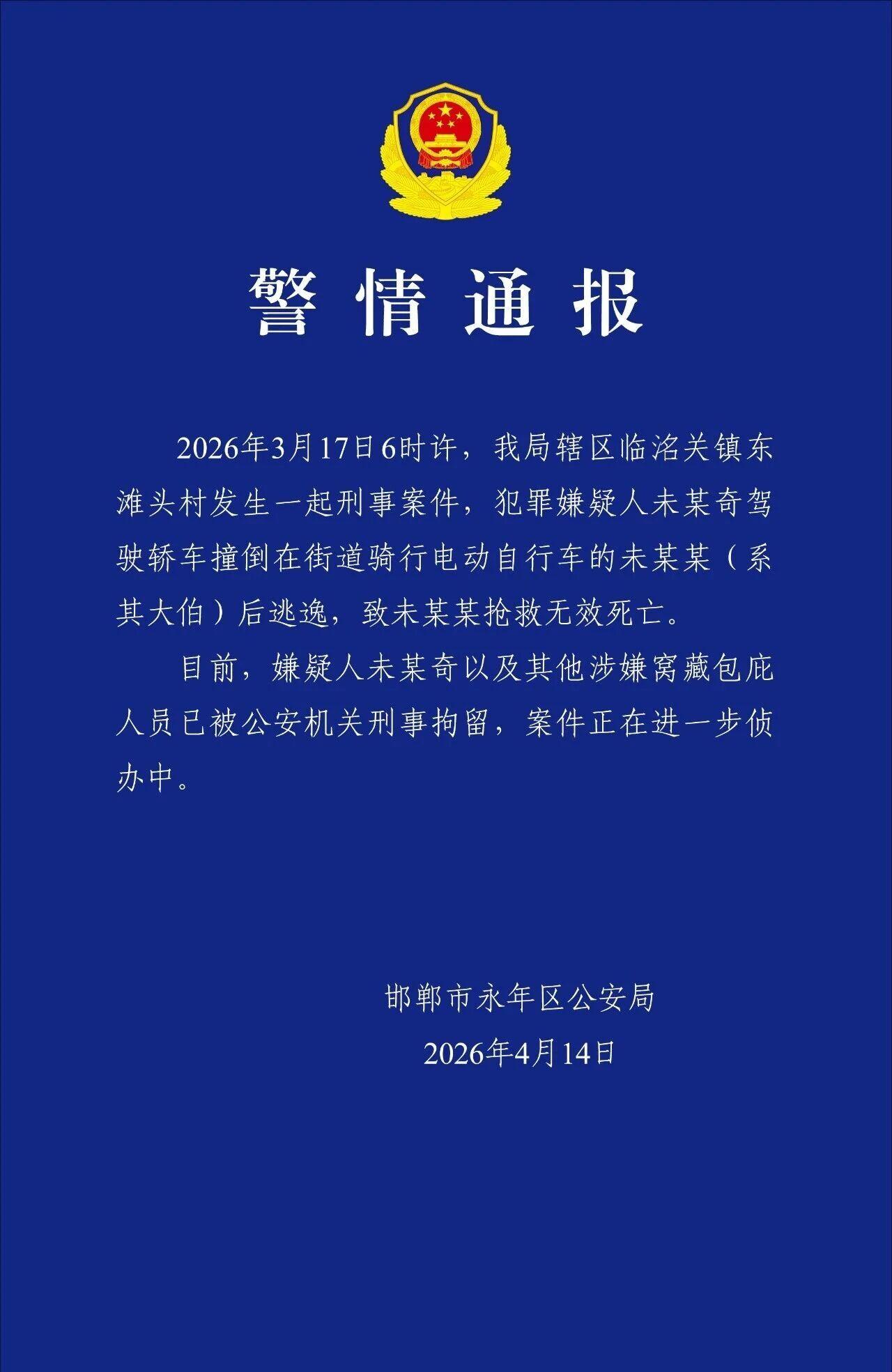 2026年3月17日6时许,该局辖区临洺关镇东滩头村发生一起刑事案件,犯罪嫌疑人未某奇驾驶轿车撞倒在街道骑行电动自行车的未某某(系其大伯)后逃逸,致未某某抢救无效死亡。