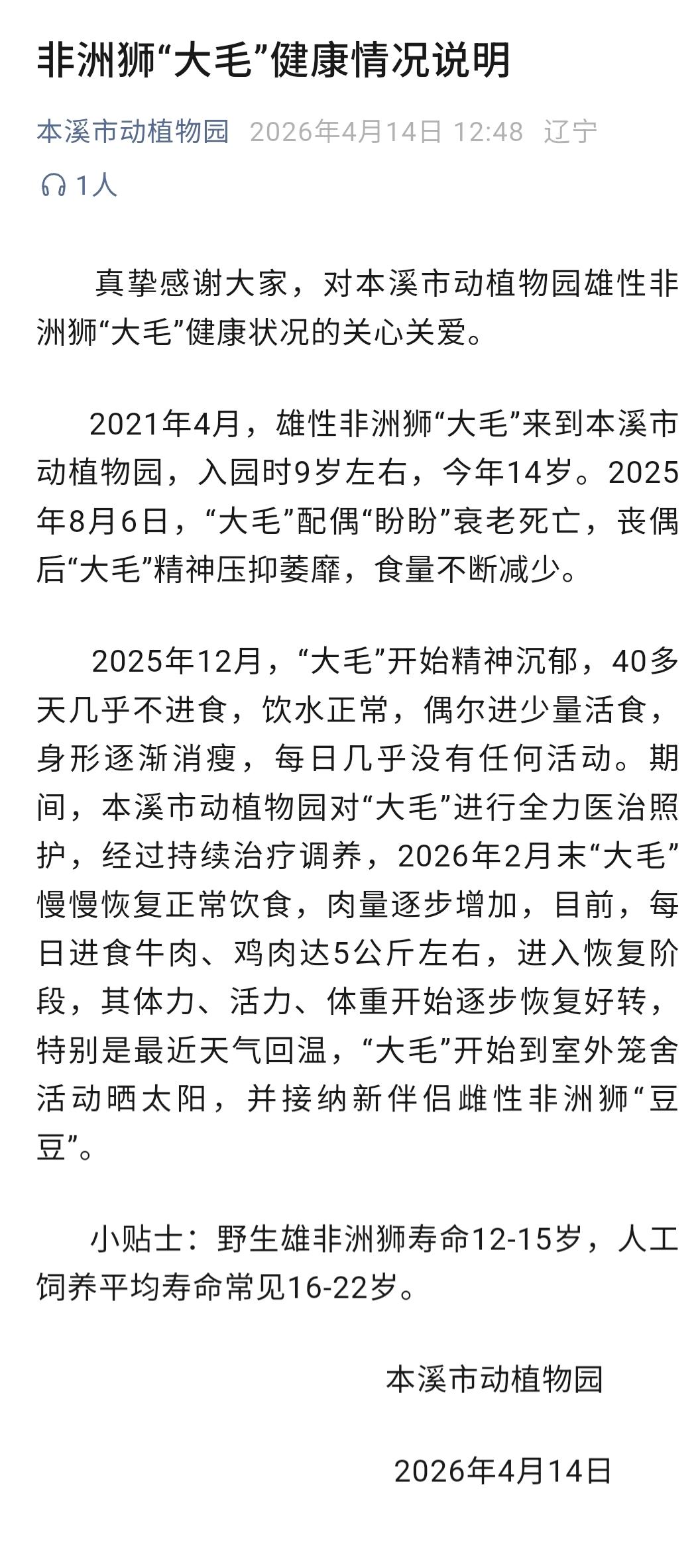 2021年4月,雄性非洲狮“大毛”来到本溪市动植物园,入园时9岁左右,今年14岁。2025年8月6日,“大毛”配偶“盼盼”衰老死亡,丧偶后“大毛”精神压抑萎靡,食量不断减少。