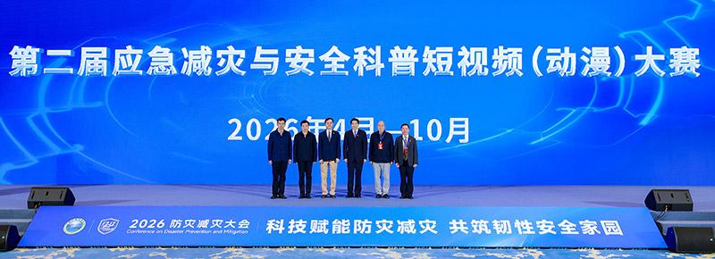 4月17日上午,在2026防灾减灾大会主论坛上,中国灾害防御协会会长郑国光,中国工程院院士范维澄,应急管理部宣传教育中心副主任李增波,中国灾害防御协会副会长陈小军,中国动漫集团党委书记、董事长史自文等领导嘉宾共同登台,宣布大赛正式启动。