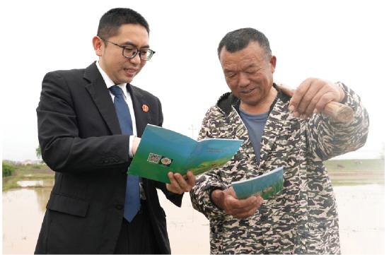 图为3月11日,江西省丰城市人民法院尚庄法庭法官在泉港镇稂洲村向正在耕作的农户宣传法律知识。 刘赛 摄