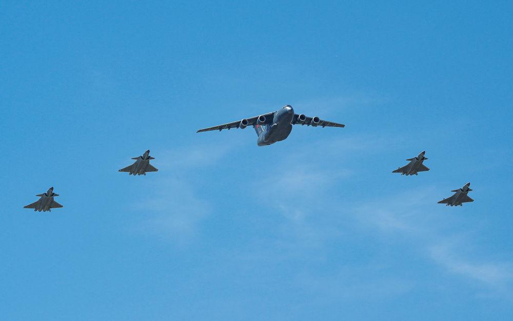 4月22日,接迎第十三批在韩中国人民志愿军烈士遗骸回国的空军运-20B飞抵沈阳,4架歼-20战机护航。新华社记者李钢摄