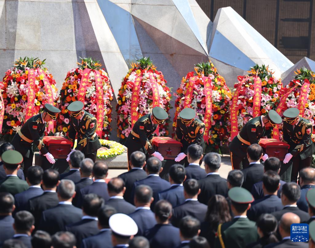 10时许,仪式正式开始,军乐队奏响悠扬的《思念曲》。礼兵在仪仗官兵持枪护卫下,护送志愿军烈士遗骸棺椁缓步进入纪念广场,全场肃立,奏唱中华人民共和国国歌。致祭文后,现场全体人员向志愿军烈士遗骸垂首默哀,并三鞠躬。27名礼兵连续鸣枪12响,向英烈致以崇高敬意。
