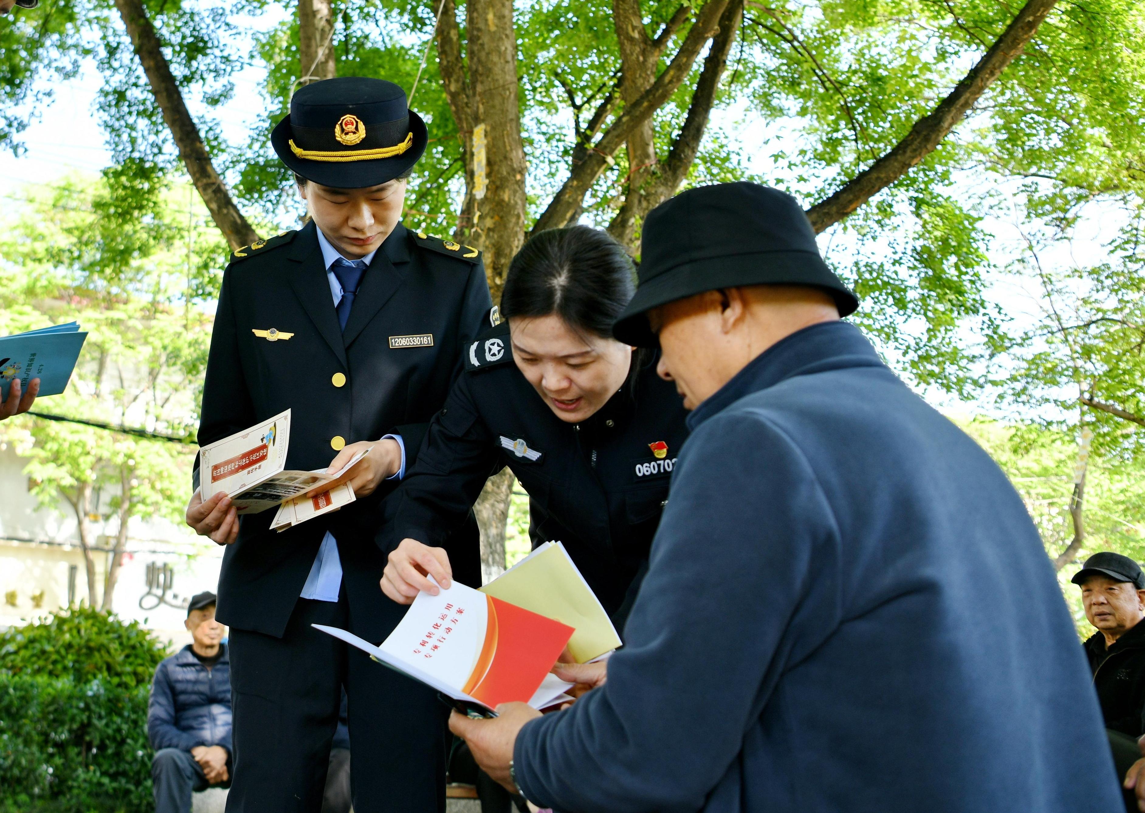 4月24日,安徽省阜南县公安局民警、市场监督管理局执法人员和司法局工作人员在街心公园向群众普及知识产权保护相关法律法规知识。