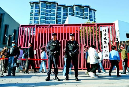 雄安新区公安局勤务大队队员刘康宁、赵宇和在幼儿园门口执勤。