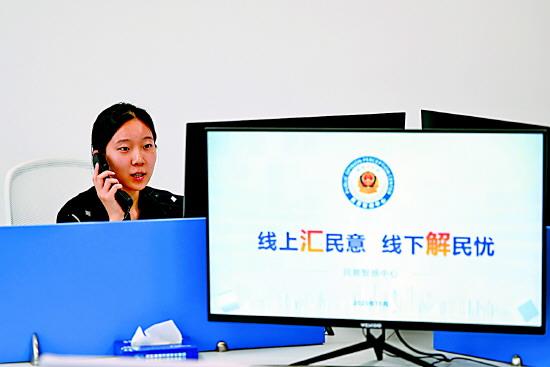 4月20日,河北雄安新区公安局民意智感中心民警周佳欣正在接听警务民意热线。