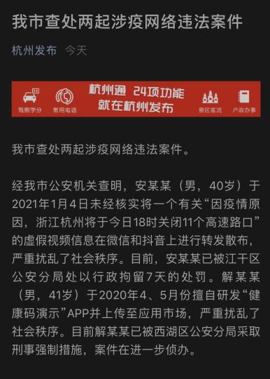 公告还通报了另一起涉疫网络违法案件,安某某(男,40岁)于2021年1月4日未经核实将一个有关“因疫情原因,浙江杭州将于今日18时关闭11个高速路口”的虚假视频信息在微信和抖音上进行转发散布,严重扰乱了社会秩序。目前,安某某已被杭州市公安局江干区公安分局处以行政拘留7天的处罚。