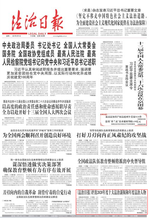 由法治日报社主办,以“梳理年度法治新闻,推动中国法治进程”为宗旨的2020年度十大法治新闻和年度法治人物评选结果2月28日在此间揭晓。经初评委员会推荐,网络、新媒体投票,终评委员会定评等程序,“中央全面依法治国工作会议召开 确立习近平法治思想的指导地位”等入选十大法治新闻,阳昌绍等10人当选年度法治人物。本次评选首次增设了年度法治人物提名奖,丁良浩等10人获得年度法治人物提名奖。