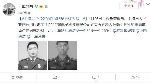 中新网4月26日电 据上海市消防救援总队官方微博消息,4月26日,应急管理部、上海市人民政府分别评定在“4.22”胜瑞电子科技有限公司火灾灭火救人行动中牺牲的丰晨敏、汤伟佳同志为烈士。