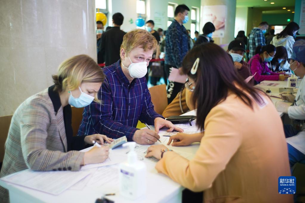 4月15日,在位于北京经济开发区的一处新冠疫苗接种点,外籍人士接种新冠疫苗前填写个人信息。新华社记者 彭子洋 摄