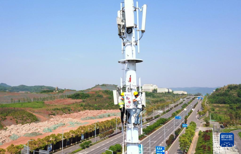 工作人员在位于重庆高新区高新大道的5G基站建设现场作业(2020年4月15日摄,无人机照片)。新华社记者 王全超 摄