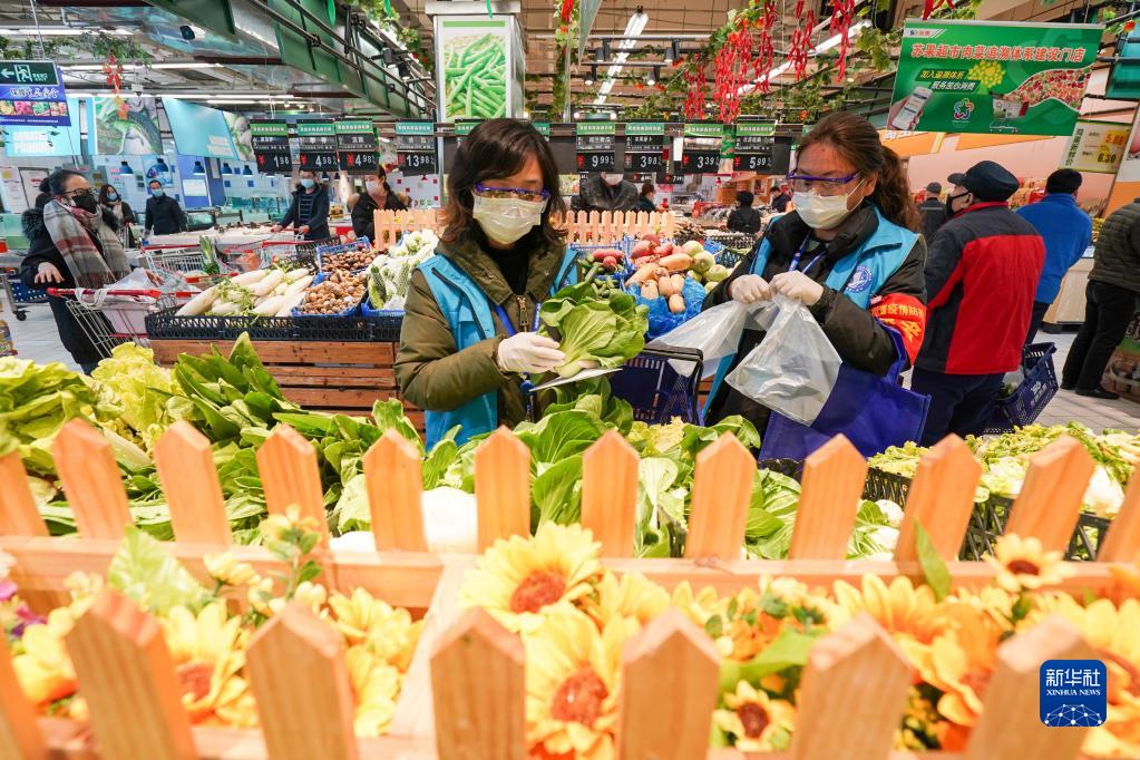 南京市建邺区南苑街道兴达社区的网格长范璐(左)和同事在超市为辖区内居民代购蔬菜(2020年2月17日摄)。新华社记者 李博 摄